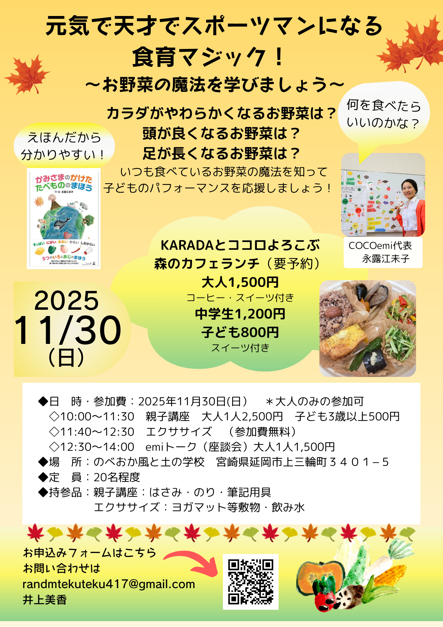 ホーム 2018/7/28 2025/7/22勝手に元気になる人を増やしたい! COCOemi魔法のバランスレッスン!!健康・子育て・人間関係の悩み自分で解決にたどり着けます! 講師五行相関図 ~あなたの五行に合う講師は誰?~お知らせ 江未子先生が宮崎県延岡市に! 2025年10月7日 リクエストにお答えして、江未子先生が 延岡にて親子講座開催します! 大人だけの参加もOK! 井上美香先 … えみこ先生が東京と大阪に! 2025年9月3日 10月11日(土)、12日(日)リアル講座を東京と大阪にて開催いたします!! 若干名ですが、一般募 … 宮崎でも親子講座が開催されます! 2025年7月10日 江未子先生の親子講座がなんと! 宮崎で開催されます!! この機会をお見逃しなく♪ 詳しくは、こちら … 広島で親子講座が開催されます! 2025年7月7日 夏休みの7月25日(金)に広島で 江未子先生の親子講座が開催されます!! 夏休みの自由研究にピ … COCOemiオンラインショップ開設しました! 2025年3月23日 なんと!! COCOemiオンラインショップが開設されました👏&# …講座・イベントスケジュールはこちら